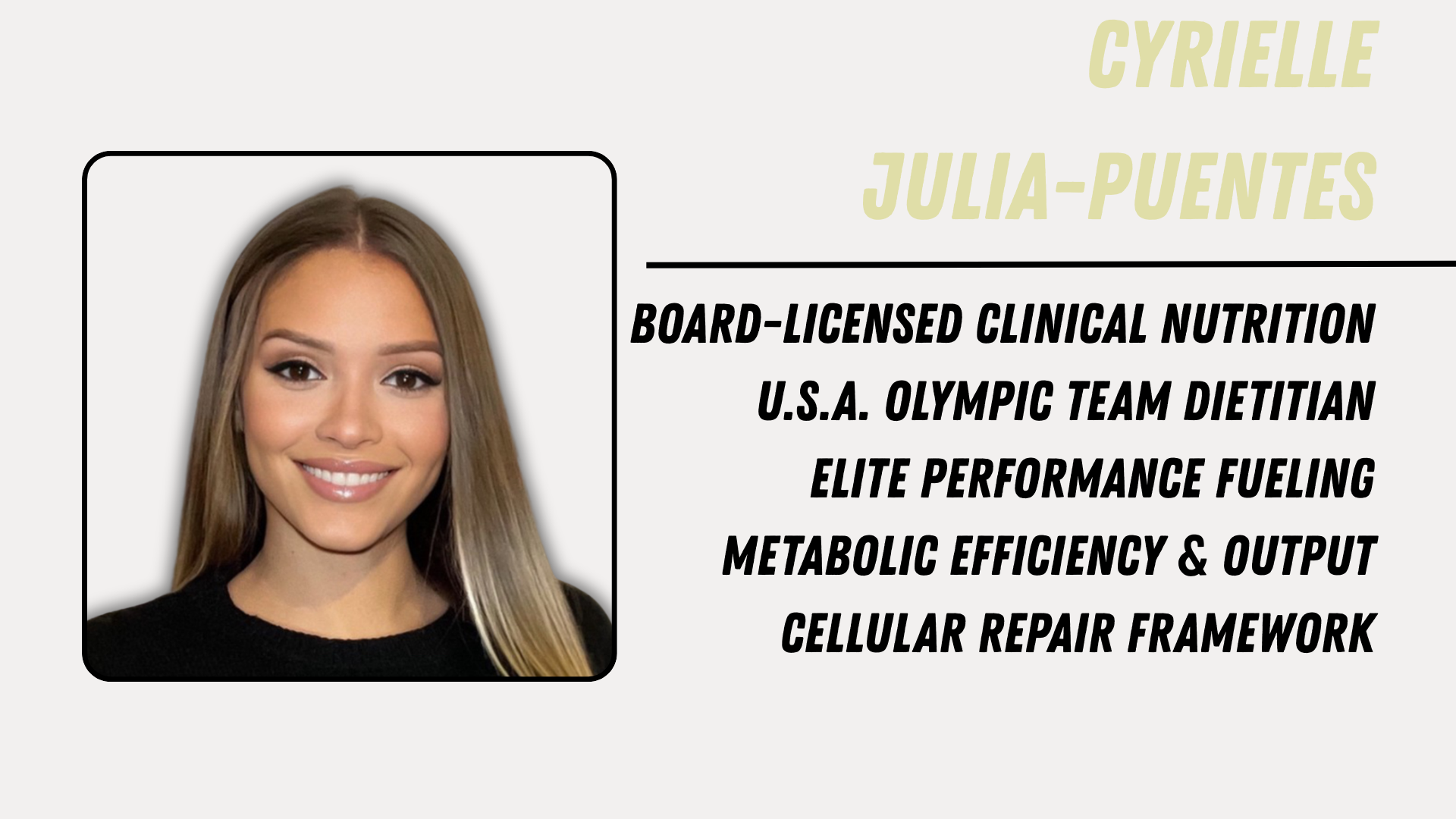 Cyrielle Julia Puentes is a Registered Dietitian and Performance Nutrition Coach for the U.S.A. Boxing Team, where she fuels elite athletes competing at the highest levels of international sport. Her knowledge in high-performance nutrition brings precision, metabolic efficiency, and recovery optimization to our members' clinical nutrition framework. She ensures that fueling strategies are evidence-based, culturally relevant, and performance-driven.